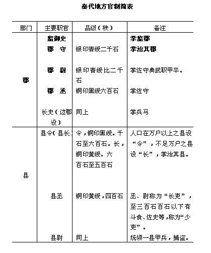自战国以来,各国相继设置郡县。秦孝公十二年(前350 年),商鞅合并了全国的乡村聚落,分设为县,置县令。惠文王十年(前328年),魏国割交上郡,后十三年(前315年),秦又置汉中郡。从此以后,郡县制逐渐在秦境内推行起来。始皇二十六年,分天下为三十六郡,后增设至四十多郡。 京师是国都所在地,它的机构设置与列郡有所不同,不设郡守,而设内史为京师长官,《汉书·百官公卿表》云:“内史,周官,秦因之,掌治京师。”内史可以参与朝议,位同列卿,所以往往被作为中央官看待。内史的人选多从优秀郡守中遴任。内史属官可参用他郡人士,秩禄高于列郡。属吏有都水长、丞,铁官长,丞。廪牺令、丞,主管谷仓和饲养牲畜,以供祭祀。 郡设监御史,郡守,郡尉,分管一郡之政治、军事。 监御史,又叫郡监,《汉书·百官公卿表》云:“监御史,秦置,掌监郡。”《史记·萧相国世家》载:“秦御史监郡者与从事,掌辨之。”集解引苏林注:“秦时无刺史,以御史监郡。”监御史隶属于御史中丞,是中央监临地方之官。 郡守,为一郡之长,六国均有此官,《汉书·百官公卿表》云:“郡守,秦置,掌治其郡,秩二千石,有丞,边郡又有长史,掌兵马,秩皆六百石。”郡守握有很大权力,除各县令长由中央任命外,一郡属吏都由郡守从本郡人士中辟举。其治郡方略,得以发挥个人才干,朝廷不加干预。 郡丞,协助郡守处理事务。边疆的郡,另有长史①,掌管兵马,郡守有缺,丞或长史代行其职,属吏有卒史、主簿、牧师令。 卒史,萧何、周昌与其从兄均当过泗水郡卒史。 主簿,主管郡守府中簿书,《水经注·江水注》引《风俗通》云:“李冰为蜀守,主簿刺杀江神。” 牧师令,《通典·职官七》云:“秦汉边郡,置六牧师令。” 郡尉,《汉书·百官公卿表》云:“郡尉,秦官,掌佐守典武职甲卒,秩比二千石。有丞,秩皆六百石。”《后汉书·桓帝纪》注引《汉官仪》云:“秦郡有尉一人,典兵禁,捕盗贼。”可见尉的职掌有二:一是辅佐郡守管理甲兵;二是主管逮捕盗贼。如秦二世时,任嚣曾任南海郡尉。尉下有丞,内地各郡设1人,大郡2人。边塞郡,百里一尉,尉下设士史、尉史各2人,负有保卫边塞的责任。郡尉直接受命于朝廷,独立开府者与郡守相等,不受郡守管辖。所以,在一郡之中,监御史、郡守、郡尉之间,虽然职务相联,但却不互相隶属。在关塞要地还设关都尉。又据《通典》引《汉官旧仪》云:“汉承秦制,郡置太守治民,断狱都尉治狱,都尉治盗贼甲卒兵马。”从这记载看来,好象秦时一郡有两尉。所以《通典》又说:“始皇并天下,郡置一守、一丞、两尉以典之。”这样,典兵断狱本来是有分职的。 郡以下设县,少数部族地区则设道,其体制与县相当。 县设令、长,《汉书·百官公卿表》载:“县令长,皆秦置,掌治其县,万户以上为令,秩千石至六百石。减万户为长,秩五百石至三百石。皆有丞,尉,秩四百石至三百石,是为长吏。百石以下有斗食,佐史之秩,是为少吏。”其实,县令、长是袭用六国的官称,非秦创置。县令、长均由朝廷任命。丞助令长办事,尉统一县甲兵,捕盗。丞尉是一县之长吏,斗食、佐史称为少吏。其属吏还有: 主吏,也称功曹,主管选用县之少吏和考绩。萧何曾任过沛县主吏,所以《史记·萧相国世家》称:“何于秦时为刀笔之吏”,就是说他主管考课之事。 令史,主管文书,荀悦《汉纪》一云:“陈婴故东阳令吏”,又《史记·项羽本纪》云:“陈婴故东阳令吏”。集解引晋灼注:“汉仪注曰:令吏曰令史,是令吏即令史也。” 狱掾,主管监狱,曹参曾为沛狱掾。曹咎曾为蕲狱掾,司马欣曾为栎阳狱掾。 文无害,《史记·萧相国世家》云:“萧相国何者,沛丰人也,以文无害为沛主吏掾。”《续汉书·百官志》说:“秋冬遣无害吏案审诸囚。”《史记》集解引《汉书音义》说:“文无害,以文无所枉害也。律有无害都吏,如今言公平吏。”《秦会要》引黄侃语云:“犹今人言笔下不错。” 厩驺,掌管一县之车马事宜,又叫厩司御。夏侯婴曾任沛县厩驺。 仓吏,主管仓储,《史记·货殖列传》云:“任氏为秦督道仓吏。”韦昭注:“督道,秦时边县名。” 狱吏,又叫治狱吏,监狱差役。任敖少年时曾当过狱吏。 县以下的组织是乡,乡以下是亭,亭以下是里。《汉书·百官公卿表》云:“大率十里一亭,亭有长,十亭一乡,乡有三老,有秩,啬夫,游徼。” 三老,掌一乡之教化,凡有忠孝节义可以为民表率者,皆旌表其门,以为倡导。《墨子·备城门篇》云:“召三老在葆宫中者。”《管子·水地篇》云:“与三老里有司伍长行里。”《史记·滑稽列传》也有三老之称。 有秩,啬夫,大乡达到五千户的,郡给指派有秩。小乡不到五千户的,县给指派啬夫,二者不同时设置,但职责相同,主调解纠纷,平断曲直,收赋税,征徭役。 游徼,掌巡察盗贼。 亭长,《史记·高祖本纪》正义云:“亭长,主亭之吏……民有讼诤,吏留平辨,得成其政。”亭长之下设亭父、求盗两卒。《史记·高祖本纪》集解引应劭注:“旧时亭有两卒,一为亭父,掌开闭扫除,一为求盗,掌逐捕盗贼。” 县尉、游徼、亭长,都要经常习练刀枪弓弩,带剑佩刀,持盾披甲以防盗贼。 民户聚居之处叫做里,犹如现在的“居民点”。孔子说:“里仁为美。”就是指邻里的里而言。一里居民多少不等。里设里正(秦讳“正”,改称里典),掌一里百家事,官名源于战国。《韩非子·外储说右篇》云:“訾其里正与伍老”可