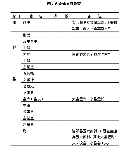 晋地方官制有郡、国二种,晋武帝灭吴以后,取得暂时统一,便改革秦、汉的旧制,重新分封五等爵士,与郡县制并行。其等级虽繁,但只有王、侯二级较为重要。王国以内史当郡守,侯国以相当县令,这与汉制相差不大。所不同的是,诸王多带刺史将军衔,典兵出镇;也有在中央任职,而本身并不出居所封之国。那些兼将军、刺史的,有长史、司马为其僚佐,事实上是代行其职权。南齐时又置典签,专在王之左右密切监视,权威反在刺史之上,称为签帅。因此,分封之爵士,仍属空名,不过在王侯之中又增添若干官吏而已。 晋封诸侯王国,分大、中、小三等,为重其兵权,大国置中军2,000人,上、下军各1,500人;次国上军2,000人,下军1,000人;小国又分三等:大国置守士100人,次国80人,小国60人。王国置师、友、文学各1人,改郡太守为内史,减省相及仆,有郎中令、中尉、大农,号称三卿。大国置左右常侍各1人,减郎中,置侍郎2人,典书、典祠、典卫、学官令、典书丞各1人,治书4人,中尉司马、世子庶子,陵庙牧长各1人。又有谒者4人、中大夫6人、舍人10人等,这些皆由国王自选文武官员充任。郡侯县公也如小国制度。公侯以下置官属,随国大小而异。 晋的地方官制也是州、郡、县三级制。州置刺史、别驾、治中从事(意谓居中治事、主众曹文书)、诸曹从事等员。又有主簿、门亭长、录事、记室书佐、诸曹佐、守从事、武猛从事等。共有吏员41人,卒20人。诸州边远,或有山险,临近寇贼羌夷的地方,又置弓马从事50余人,凉州、益州置吏85人,卒20人,徐州置淮海从事,凉州置河津从事,诸州置都水从事各1人,荆州又置监佃督1人。 郡皆置太守,河南郡为京师所在,特置河南尹。郡国户不满五千者,置职吏50人,散吏13人;五千户以上,置职吏63人,散吏21人;万户以上,职吏69人,散吏39人。此外,郡国不分大小,皆置文学掾一人。 郡下为县,大县置令,小县置长,下设主簿、录事史、主记室史、门下书佐、幹、游徼、议生、循行功曹史、小史、廷掾、功曹史、小史书佐幹、户曹掾史掾、法曹门幹、金仓贼曹掾史、兵曹史、吏曹史、狱小史、狱门亭长、都亭长、贼捕掾等员。户不满三百以下,职吏18人,散吏四人;户三百以上,职吏28人,散吏6人;户五百以上,职吏40人,散吏8人;户千以上,职吏53人,散吏12人;户千五百以上,职吏68人,散吏18人,户三千以上,职吏88人,散吏26人。每县均置方略吏4人,洛阳置六部尉,东晋以后建康也置六部尉,其余大县置2人,次县、小县各置1人。 县之下置乡,五百户以上置1乡,三千户以上置2乡,五千户以上置3乡,万户以上置4乡,每乡置啬夫1人。乡户不满千以下,置治书史1人;千以上置史、佐各1人,正1人;五千五百户以上,置史1人,佐2人。乡以下为里,百户置里吏1人,其地广人稀,听随宜置里吏,但不得少于五十户。千户以上置校官掾1人。 魏晋南北朝时期,由于南北分治及新开发地区增多之故,州的数目日多而辖境日狭。重要的军政长官往往兼督数州,或者此州之部分郡县而兼另一州之某些郡县,因此区域的划分不是经常固定的。由于战争的频繁,刺史、郡守之权极重,往往带将军称号。这种刺史,多开幕府,置僚属,形成地方政权。《通典·职官一四》说: 自魏晋以后,刺史多带将军“开府”,则州与府各置僚属,州官理民,府官理戎。 又《职官一五》说: 晋郡守皆加“将军”,无者为耻。 刺史任重者,则加以使持节都督某州或某某数州军事。凡不带军职的刺史,则称“单车刺史”。《通典。职官一四》说: 魏晋为刺史,任重者为使持节都督,轻者为使持节…… 自魏以来,庶姓(非帝族)为州而无将军者,谓之单车刺史。 由于都督、刺史开府置僚属而造成地方政权机构繁杂,吏员无限增多的弊端。《晋书·傅玄传》载,咸宁初,傅玄之子傅咸上书晋武帝说: 旧都督有四,今并监军乃盈于十。夏禹敷土分为九州,今之刺史几向一倍。户口比汉十分之一,而置郡县更多。空校牙门,无益宿卫,而虚立军府,动有百数。五等诸侯,复坐置官属。……以为当今之急,先并官省事,静事息役,上下用心,唯农是务也。 傅咸当时已看出机构多、官属多的问题,要求晋武帝省官并事。西晋政府对这个问题也引起重视,曾经“议省郡县半吏以赴农功”,可是这件事却遭到中书监荀勖的反对,《晋书·荀勖传》载,荀勖对此事的看法是“省吏不如省官,省官不如省事,省事不如清心”。因而,省官并事,以劝农功之论未能付诸实施。由于机构多、官属多,自然造成许多一人兼数职而无从顾及。干宝《晋纪总论》说: 秉钧当轴之士,身兼官以数十,大极其尊,小录其要,机事之失,十恒八九。 象晋武帝时的王祥,既拜太保,又被“加置七官之职”。他做太保,本来就“萧然自放”,再加七个官职,这七官自然也更加“萧然自放了。” 机构多,官僚多,兼职多,表明了西晋这个封建国家是一部运转不灵的机器。干宝的《晋纪总论》在评论西晋官场风气时说: 进仕者以苟得为贵,而鄙居正;当官者以空望为高,而笑勤恪。……刘颂屡言治通,傅咸每纠邪正,皆谓之俗吏;其倚仗虚旷,依阿无心者,皆名重海内。……由是毁誉乱于善恶之实,情慝奔于货欲之涂。选者为人择官,官者为身择利。……悠悠风尘,皆奔竞之士,列官千百,无让贤之举。 这段话中肯地揭露了西晋官场的腐败作风。 西晋亡后,中原士族及其部曲相率南迁,东晋政权往往在南方各地设立侨州、侨郡、侨县以安置之。