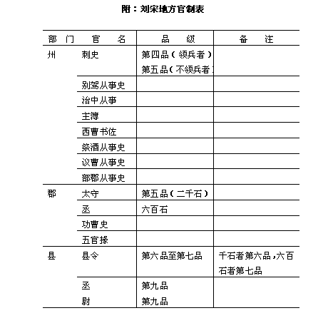 刘宋地方官制,仿照两晋,行州、郡、县三级制。州设刺史一人,分领兵刺史(第四品)和不领兵刺史(等五品),下置别驾从事史,治中从事史,主簿,西曹书佐,祭酒从事史,议曹从事史、部郡从事史。自主簿而下,每州置多少人,无定制。别驾、西曹负责官吏及选举之事,治中主众曹文书之事,祭酒分掌诸曹兵、贼、仓、户、水诸事。扬州不设祭酒,而以主簿负责其事。 郡置太守1人,秩二千石;丞1人,秩六百石,下设功曹史,主选举;五官掾,主诸曹事。又有主犯史,主催督期会。又设上计掾、史各1人,每岁终向上条陈郡内众事,称为“阶簿”。 郡下设县,大县置令,小县置长1人、丞1人,大县置尉2人,小县1人。 县下置乡,乡的建制略如前代。