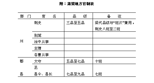 萧齐地方官制,也是州、郡、县三级,官员设置同刘宋。 萧梁地方官制,亦略同刘宋,州置刺史1人,二千石。别驾、治中从事各1人。又置主簿,西曹从事、议曹从事、祭酒从事、部传从事、文学从事,员额不等,各因其州之大小而定。 郡置太守、郡丞。郡为国则称内史。郡丞,三万户以上置佐1人。 郡下设县,县为封国者称相。大县为令,小县为长,皆置丞、尉。郡与县均置吏,员额均以郡县之大小而定。郡县吏中有书僮,武吏,医,迎新,送故等员,亦各因其郡县大小而置。 陈承梁制,地方官员之设置皆沿其旧制。