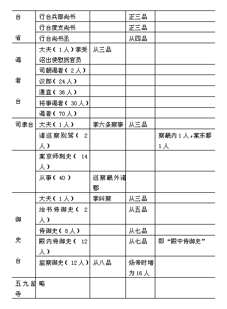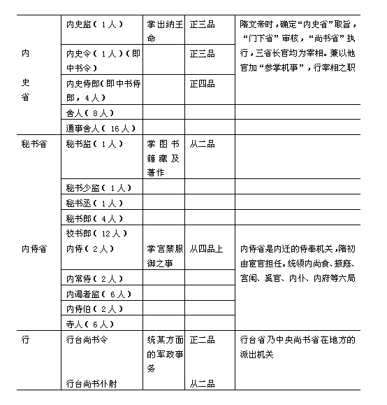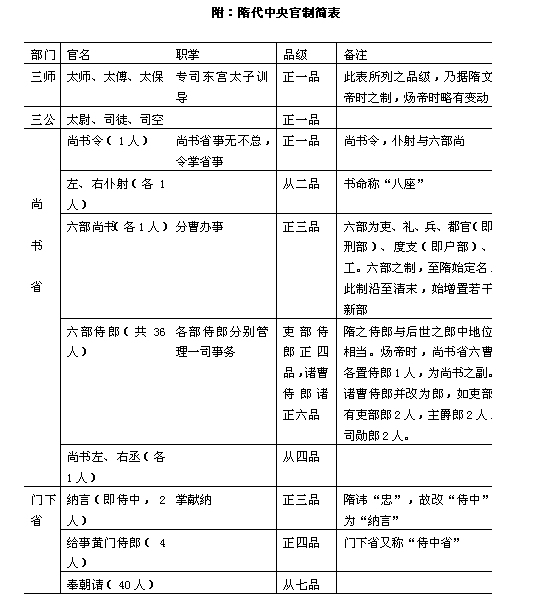 隋文帝即位后。对兵役制度作了重要改革,以加强对军事的控制。同时,也对行政机构进行了一些改革。开皇元年(公元581年),杨坚登位不久,立即采纳了大臣崔仲方的建议,废除北周模仿《周礼》在中央设立的“六官”制度,“依汉魏之旧”建立中央机构。《隋书·百官志》说: 高祖践极,百度伊始,复废周官,还依汉魏。唯以中书为内史、侍中为纳言、自余庶僚,颇有损益。 皇帝是最高的主宰,握有军政的绝对大权。辅佐皇帝处理全国军政机要的主要有三省,即尚书省、内史省、门下省。三省长官都是宰相。 隋代的尚书省地位很高,管理全国政务。《隋书·百官志》说:“尚书省,事无不总”。这句话说明了尚书省在中央最高行政机构中权力之大,地位之尊。当然,这并不是说尚书省包揽一切。尚书省的总官署名叫尚书都省,置尚书令、左右仆射各1人,总领吏部、礼部、兵部、都官(开皇三年改刑部)、度支(开皇三年改民部)、工部等六部。六部长官是尚书,与尚书令、左右仆射合称“八座”。吏部掌文官选授考课,吏部尚书绞吏部侍郎2人,主爵侍郎1人,司勋侍郎2人,考功侍郎1人。礼部掌学校、礼乐。礼部尚书统礼部。祠部侍郎各1人,主客,膳部侍郎各2人。兵部掌军籍舆马,兵部尚书统兵部,职方侍郎各2人,驾部,库部侍郎各1人。都官掌刑政司法,都官尚书统都官侍郎2人,刑部,比部侍郎1人,司门侍郎2人。度支掌财税出纳,度支尚书统领度支。户部侍郎各2人,金部、仓部侍郎各1人。工部掌工程建造,工部尚书统工部。屯田侍郎各2人,虞部、水部侍郎各1人。六部共24曹36侍郎,分司曹务,直宿禁省。尚书省的长官为尚书令,实际上一般不授人,隋代只有炀帝时的杨素因为有翊戴之功,又平定了汉王谅,方进位尚书令。但是炀帝对他“外表殊礼,内情甚薄”。他有病,炀帝虽然频频遣名医赐药,“然密问医者,恒恐不死”。所以隋代尚书省长官实际上是左右仆射(从二品)。其中左仆射判吏部,礼部,兵部,兼掌纠弹;右仆射判都官,度支,工部,兼知财政用度。仆射的属官有左右丞各1人,都事8人。炀帝时把都事拨到六部去了,另增设左右司郎各一人来代替,他们就是唐代左右司郎中的前身。隋代尚书是一个机构完整的中枢政务部门,与前代大不相同。“侍郎”掌一“司”之事,与后代的“侍郎”不同。 门下省在隋初是侍奉谏议机关,掌审查政令及封驳诸事。其长官有纳言二人(正三品),它本是侍奉内廷,以备皇帝之顾问。《隋书·柳机传》载,柳机在文帝开皇年间为纳言,“当近侍,无所损益,又好饮酒,不亲细务”。所以不久就出为华州刺史。次官有给事黄门侍郎4人,负责纠正奏章得失。《隋书·柳雄亮传》载,雄亮任给事黄门侍郎时,“尚书省凡有奏事,雄亮多所驳正,深为公卿所惮”。炀帝时去“给事”二字,另加置给事郎4人,这就是唐代给事中的前身。此外,还有录事、通事令史各6人。隋初还有散骑常侍,通直散骑常侍各4人、谏议大夫7人,都是谏官。炀帝说他生性不喜人谏,所以把谏官全部罢废了。隋初,门下省还掌皇帝衣食供奉等日常生活事务,统城门、尚食、尚药、符玺、御府、殿内等六局。城门局:设校尉2人,直长4人。尚食局:设典御2人,直长4人、食药4人。尚药局:置典御2人,侍御医、直长各4人,医师40人。符玺、御府、殿内局:置监各2人、直长各4人。 与尚书省、门下省鼎足而立的是内史省。内史省后来改为内书省,为中枢的制令机关,专司起草皇帝诏令。隋初置监、令各1人,后来废监,置令1人(正三品)。内书令,本称中书令,在汉代本是掌禁中书记的,所以称“中书”。汉武帝时,司马迁受腐刑出狱后就当过中书(谒者)令。魏晋以来,中书令掌出纳王命,南朝多以诸公兼之,至隋代才以专人任其职。炀帝时,内书令已不常置,往往以其次官内书侍郎行其职。内书省的属官还有舍人8人,掌起草制令;通事舍人16人,掌宣奏。不过,在隋代也偶有内书侍郎亲自草拟诏敕,如《隋书·薛道衡传》载:高祖时薛道衡任内书侍郎,“每至构文,必稳定空斋,蹋壁而卧,闻户外有人,便怒。”其劳心焦思若此,所以文帝赞扬他说:“薛道衡作文书,称我意。” 三省之外,还有秘书省和内侍省,这是掌握具体事务的官署,秘书省掌图书籍藏整理。这个官署一般比较清闲,长官为秘书监(正三品)1人,次官有秘书丞1人。属官有秘书郎4人、校书郎12人、正字4人、录事2人,领著作曹、太史曹。著作曹掌国史修撰,有著作郎2人,佐郎8人,校书郎、正字各2人。太史曹掌天文历法,置太史令、太史丞、司历各2人,监候四人。隋炀帝大业年间,又新置儒林郎10人,掌明经顾问,唯诏所使。文林郎21人,掌撰录文史,检讨旧事。 内侍省是内廷的侍奉机关,隋初由宦官担任。置内侍(从四品上)2人为其省长。次官有内常侍2人。属官有内谒者监6人,内寺伯2人,内谒者12人,寺人6人,伺非8人,统领尚食、掖庭、宫闱、奚官、内仆、内府等六局。炀帝时改内侍省为长秋监,有长秋令、少令、丞等皆用士人,低级役使人员则用宦官。 以上是隋代中枢机构的“五省”,朝廷内外政务皆由其统辖,为中央最高执政机关。 隋初的监察机关只有御史台,炀帝大业三年(公元607 年)又增设了谒者、司隶二台,合称三台。御史台的长官为御史大夫(从三品)1人,次官为治书侍御史2人。属官有侍御史8人,殿内侍御史、监察御史各12人,录事2人。御史职掌纠察弹劾。如《隋书·李孝贞传》载:隋初