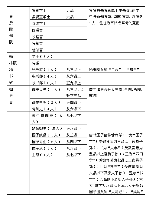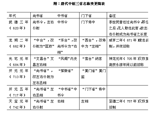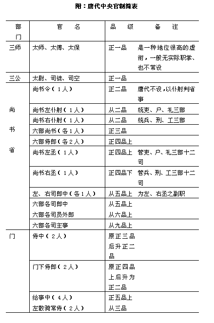 唐代的官制基本是沿袭隋制。《新唐书·百官志》云:“唐之官制,其名号禄秩虽因时增损,而大抵皆沿隋故。” 以皇帝为首的封建国家体制,在唐高祖武德时期就比较完备地建立起来。皇帝掌握着国家的最高权力,操有对一切臣民生杀予夺的大权。法律和法令都以皇帝的名义颁布,皇帝有权修改法律和法令,并可以不受法律和法令的约束。在皇帝之下,有三省、六部、九寺、五监等职官体系。在中枢机构中,制令机关、封驳审议机关与行政事务机关是分工而又合作的。政务机关和事务机关的职责是很分明的,监察机构也很完备。此外,还有一套比较完备的品阶勋爵制度。《新唐书·百官志》说: 其辩贵贱,叙劳能,则有品、有爵、有勋、有阶,以时考覈而升降之,所以任群材、治百事……方唐之盛时,其制如此。 随着社会矛盾的发展和政治形势的变化,唐代的职官制度也发生了变化。“使职差遣”逐渐侵夺了原来职官的权力,新出现的一些使职,使得原来的一套官僚体系发生了紊乱。他们占据了中央与地方的大部分权力。当时的局面,正如李肇《唐国史补》所说的“为使则重,为官则轻”。这种现象对宋代官制也有一定的影响。唐代的中央官制大致有以下几个系统: 一、同中书门下平章事与政事堂 唐代初年,以中书省长官中书令、门下省长官门下侍中、尚书省长官尚书令共议国政,都是宰相。宰相是辅佐皇帝总领天下大政的官员。《新唐书·百官志》说:“佐天子总百官,治万事,其任重矣”。后来,因为唐太宗即位前虽曾任过尚书令,臣下避而不敢居其职,便以仆射为尚书省长官,与门下侍中、中书令号称宰相。据《册府元龟·宰相总序》说,自隋代以来,就有“或以他官参掌机事及专掌朝政者,并为辅弼”。唐代也因宰相品位尊崇,人主不肯轻易授人,故常以他官居宰相职,并假借他官之称。如唐太宗时,杜淹以吏部尚书参议朝政,魏征以秘书监参预朝政,其后,或称“参议得失”,或称“参知政事”等等,名称不一,都是宰相之职。《旧唐书·李靖传》载贞观八年(公元634年),中书令(《百官志》作仆射)李靖因足疾上表“乞骸骨”,其言辞极为恳切,唐太宗为之感动,说:朕观古往今来,身居富贵,能知足者甚少。纵然才能不堪,身患疾病,犹自强居职位。公能识大体,精神诚可嘉。于是,太宗除下优诏,令其在家调养外,又命其疾小愈,两、三日一至中书门下平章事。贞观十七年(公元633年),太宗以李勣为太子詹事(东宫百官之长),并特加“同中书门下三品”之衔,使其与侍中、中书令一样参预宰相职事。从此之后,就有“平章事”与“同三品”的衔号,就是品级再高的官,也不例外,否则,就不能行使宰相的职权,只有三公、三师及中书令不加,永淳元年(公元682年),以黄门侍郎郭侍举,兵部侍郎岑长倩等同中书门下平章事,自此以后,“同平章事”也成为宰相的衔号。开元以后,为仆射者例不加“同平章事”,结果就不能参与宰相机务,而被挤出宰相行列。 安史之乱以后,宰相名号又有了变化。由于代宗大历十二年(公元777年)升中书令和门下侍中为正二品,所以就废除了“同中书门下三品”的职衔。与此同时,中书令和门下侍中基本是藩帅兼领,几乎不单独作为宰相来设置,因此,唐后期的宰相名号基本上就是“同平章事”了。 唐代初年,三省长官在门下省议事。这个议事地点称为政事堂。《文献通考·职官四》说:“中书出诏令,门下掌封驳,日有争论,纷纭不决,故使两省先于政事堂议定,然后奏闻”。其后,高宗时的裴炎自侍中迁中书令,乃徙政事堂于中书省。玄宗开元十一年(公元723年),张说为中书令,又改政事堂为“中书门下”,并且列吏房、机务房、兵房、户房、刑礼房五房于后,“分曹以主众务。”至此,政事堂已从“议事”之所变成宰相的办事机关了。产生这个变化的原因是因为唐玄宗以前,宰相都是三省长官兼职的(因三省长官尚有本省常务),他们上午在政事堂议事,下午就回本省办公,因此,不必要另立宰相的办公机关。玄宗开元以后,宰相数量少了,其职位更为尊崇,基本上是专职的(杨国忠虽身兼四十余职,但也以相职为主),于是就有必要设立一个固定的宰相办事机关,并列五房以处理日常行政事务。 政事堂会议是协助皇帝统治全国的决策机关。军国大事经政事堂会议商定,奏请皇帝最后裁决;机密大事以及五品以上官员的升降任免,只在政事堂议论,他官不得预闻。在政事堂(或中书门下)议事的几位宰相中,有一位是首席宰相,称为“执政事笔”。唐玄宗时,李林甫、杨国忠为相,他们之所以能专权用事,一个重要的原因,就是他们长期窃居了“执政事笔”的职位。安史之乱后,肃宗鉴于相权集中而造成个人专断之弊,乃“令宰相分直政事笔、承旨,旬日而更”。宰相十天一秉笔的制度,到唐德宗贞元十年(公元794年),才改每日一人轮流秉笔,其用意显然是在于防止宰相专权,但德宗以后,这个制度并没有沿续下去,如穆宗、敬宗时的李逢吉,武宗时的李德裕都是独秉国政的。宰相权力的大小,都是取决于皇帝(还有中晚唐时期的宦官)的态度的。 二、三省六部 唐沿隋制,中书省、门下省、尚书省同样是国家最高的政务机构,分别负责决策、审议和执行国家的政务,同时把原尚书省诸曹正式确定为吏、户、礼、兵、刑、工六部。部下有司,部的首长称尚书,副首长称侍郎,各司正、副负责人称郎中、员外郎。 隋