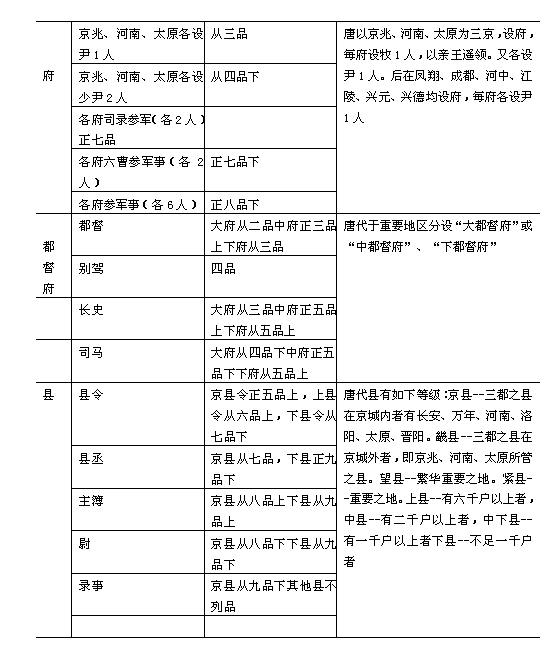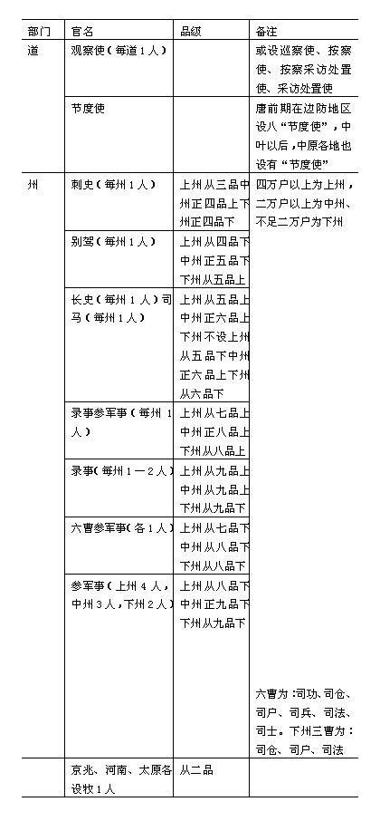 经过武德、贞观三十多年的治理,唐王朝成为一个强盛的封建国家。它的版图东达于海,西逾葱岭,北过大漠,南至林邑,皆为州县,东西9,500余里,南北10,900余里。在这块辽阔的统治区域里,由于中原地区与边疆少数民族地区社会历史条件和经济发展水平的不同,反映在地方官制上也有所差异。概而论之,中原内地是州县制或道州县制;边疆地区则为羁糜府州制;有些少数民族地区还建立自己的小王国。现根据不同情况,把唐代地方官制分为道、州、县制与少数民族之王国制两个方面介绍。 一、道州县地方行政职官 唐初依隋旧制,地方上有州(郡)、县两级。据《旧唐书·地理志》的记载,贞观十三年(公元639年)全国有358州,1,551县。州县均按其地位之轻重,辖境之大小,户口之多寡以及经济开发水平之高低分为上、中、下三等。三万户以上为上州,二万户以上为中州,二万户以下为下州;五千户以上为上县,二千户以上为中县,一千户以上为中下县,其余为下县。近京之州称辅州,京都所在县名赤县,京之旁邑谓畿县,此外还有雄、望、紧、上、中、下等级,一般也是按户口多少而定的。 州的长官为刺史,唐玄宗天宝元年(公元742年),改州为郡,改刺史为太守。后复称州,上州刺史从三品,其下佐官有别驾1人,从四品下,长史1人,从五品上,司马1人,从五品下,录事参军事1人,从七品上,录事2人,从九品下,此外还有司功、司仓、司户、司田、司兵、司法、司士等七曹参军各1人,皆从七品下。又有市令、丞、文学、医学博土等;中、下州刺史皆正四品下,其下佐官仿上州,但不全置。别驾(中州不置)、长史、司马称为“上佐”,唐制规定,凡刺史缺员或为亲王兼领时,上佐可代行州事。但在一般情况下,上佐并无具体职任,因其品高俸厚,又不亲实务,故多用以优待宗室或安置闲散官员等,所以自居易称这类官为“送老官”。诸曹参军分掌各州府的军政、财政、刑法、农田以及户粮诸事务,称为“判司”。诸曹“判司”由各州录事参军事统辖。未设司马之州,录事参军为刺史之佐,处于综领督察的地位。 县的长官不分大小统称令。京县令,正五品上;畿县令,正六品上;上县令,从六品上;中县令,正七品上;中下县令,从七品上;下县令,从七品下。佐官有县丞、主簿、县尉等(京县增设录事2人)。《新唐书·百官志》说: 县令掌导风化,察冤滞,听狱讼。凡民田收授,县令给之。每岁季终,行乡饮酒礼,籍帐、传驿、仓库、盗贼、隄道,虽有专官,皆通知。 可见县令统管一县所有军政事务,亲自处理刑狱。县丞为之副,县尉分判众曹,催征租赋,主簿掌文书簿计。此外,还有七曹佐官,是应州府七曹而设,因事务不多,一般不常设。 州、县官员都是“亲民”之官,一方面要负责刑狱治安,征敛赋役;另一方面要“宣扬德化”、“劝课农桑”,“务知百姓之疾苦”。因此,《册府元龟》卷636《铨选部·考课》说:“殊功异行及祥瑞灾蝗、户口赋役增减,当界丰俭,盗贼多少”,就是吏部考核州、县官吏政绩的标准。各州县每年造一次计帐,向尚书省报告户口及明年所征的课役。《新唐书·食货志》说,各州县必须把每年征税的数目“书于县门、村坊,与众知之”。所以,州县官员的选任,得人与否,对封建政权的稳固关系甚大。唐自太宗开始,就很重视地方吏治,据《贞观政要》卷3记载,他曾说自己“居深宫之中,视听不能及远,所委者惟都督、刺史,此辈实理乱所系,尤须得人。”他亲自过问刺史的选用,并把各地都督、刺史的名字写在屏风上,凡作“善事”的就在其名下记上一笔。贞观八年(公元634年)又派李靖等13人为诸道黜陟大使,到各地巡查,升迁廉吏,惩罚贪官,问民间疾苦。 州府的判司及县的簿、尉,虽然职位不高,但一般也是进士及第后的起家之官,若上有官员提携,下有州县推荐,几经迁转就可能入朝为郎官、御史,甚至可以外派为州刺史,直至藩帅,所以唐代一些高级文职人员大多在基层担任过这类职务。 唐代首都或陪都所在地有“府”的建制。玄宗开元元年(公元713年)改雍州为京兆府,洛州为河南府,并州为太原府,长官称“牧”,由亲王挂名遥领,实际主持府政的是“尹”。如上都京兆尹、东都河南尹、北都太原尹。后来又陆续设有凤翔、成都、河中、江陵、兴元、兴德等府,也都有“尹”,但已不置挂名的“牧”。府尹之下有少尹、录事参军事以及六曹参军事,其职掌同于州诸官,只是品秩略高而已。若皇帝不在京城,则置留守官,多由府尹或临时指定大臣兼任。由于唐代高宗、武后时多居东都洛阳,玄宗以后诸帝虽然都居住长安(除短期避乱外),但洛阳原来那一套略同于长安的职官建置并没有省去,凡在那里任职的,叫做分司东都,或称为分司,这些官员都由东都留守总之。分司各官署往往空存其名,于是朝廷常以贬降或闲废的官员安置在此。这里的官员一般是除按期拜表行香外,只领俸而不任事。只有分司御史还可以稍为行使职权。 除分司官外,还有王傅一官,也是养老的。因为唐代亲王虽有额定的官属,而亲王并不出阁。名为王傅,官居三品,实际连王的面都没有见到过。 唐代大官犯了公罪,多半是贬到远方作州县以下的官,称为左降官。这种官只有官名,没有任职,名为员外,置同正员,其实只能领少数的生活费而已。但由于大赦频繁,每经一次大赦,即有“量移”的机会(从远处移回近处),而且在君主或执政大臣有变动的时候,也很容易