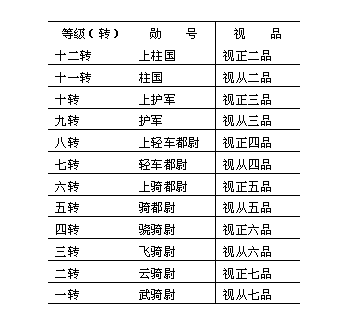 注:①两表根据《新唐书·百官志》制。 ②唐政府对三品以上官用“册授”;五品以上官用 “制授”,六品以下官用“敕授”。 二、勋官与封爵 勋官本来是赏给立功将士的荣誉称号,后来文职朝官也有赏给的。隋文帝时,采用北周之制,定勋级自上柱国至都督共十一等。唐武德、贞观时有所改易。由于当时勋官与散官名称相同,不易区分,所以高宗咸亨五年(公元674年)再加以改革,定为十二转,如下表: