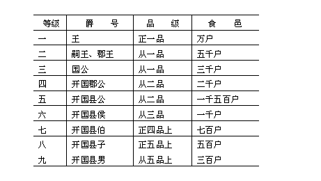 注:本表根据《新唐书·百官志》制。 据《新唐书·百官志一》载,凡以战功授勋者,主要根据其杀获敌人的多少来评定其战功之大小,进而决定其勋转的授予。例如坚城苦战,功第一者,授勋三转。在两军对阵中,以少击多,杀获敌人十分之四者,称为上获,授勋五转;杀敌十分之二者,称为中获,授勋四转;杀敌十分之一者,称为下获,授勋三转。自高宗以后,战士立功授勋者动辄盈万。由于授勋太滥,所谓勋官,便成无用的空头支票了。 除将士授勋外,其他朝官文臣以及无战功者也可授勋。这主要视其政绩之优劣而定,也有特恩赏赐者。五代承唐旧制,唯其授勋特重资历,对文武官授勋规定更为明确。据《五代会要·司勋》载,后唐天成三年(公元928年),庄宗敕曰: 近代已来,文臣官阶稍高,便授柱国,岁月未深,便转上柱国;武资初官便授上柱国。官爵非无次第,阶勋备有差等,宜自此时,重修旧制。今后加勋,先自武骑尉,经一十二转方授上柱国,仍永为常式。 但是这种制度未能坚持,所以后唐潞王时,尚书司勋郎李盈休又再次建议:“从今群官得叙封者,并请自武骑尉依次”。 封爵也是享有某种特权的封号。隋唐五代的封爵,自亲王至开国县男共九等,如下表: