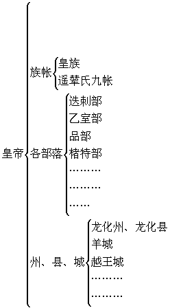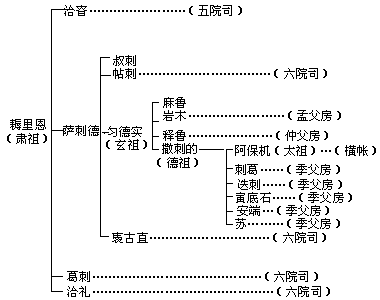 由上表可见,后代属於五院司、六院司的,共有五房,称为“二院皇族”;后代属於孟父房、仲父房、季父房和横帐的,共有一帐三房,称为“四帐皇族”;耶律阿保机本人及其后代,属于“横帐”。“横帐”之称,据《辽史·百官志一》说:“辽俗东向而尚左,御帐东向,遥辇九帐南向,皇族三父帐北向。东西为经,南北为纬,故谓御营为核帐云。”所谓“遥辇九帐”,实指遥辇氏九代可汗的后代各为一帐。 各部落:从阻午可汗时期的二十部发展而来,为“太祖二十部”。其中除了契丹族部落外,又增加了不少因俘虏而置的非契丹族部落。 州、县、城:这是一些主要用以对付汉族俘奴及其他各部落的俘奴进行编管的地方机构或据点,有一部分是设置的商业、手工业集中场所及其管理机构所在地。 附:契丹族奴隶主贵族国家初期 的国家机构系统表: