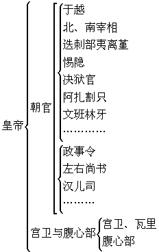 《辽史·百官志一》对辽代官制有这样一段叙述: 契丹旧俗:事简职专,官制朴实,不以名乱之,其兴也勃焉。太祖神册六年(公元921年),诏正班爵。至于太宗,兼制中国,官分南、北,以国制治契丹,以汉制待汉人。根据这段记载,我们可以看出辽代初年的官制与太宗以后的官制是不同的。因此,对辽代的官制必须分两个阶段介绍。 在耶律阿保机即帝位的初期,“官制朴实”,契丹的中央官僚机构是:在皇帝之下,大体上分为朝官,宫卫与腹心部,族帐。地方机构有部落以及州、县、城的基层组织。 于越是皇帝之下职位最高的大臣;北、南宰相,是皇帝的辅佐;迭刺部夷离堇,是在皇帝统率下,执掌兵马大权;惕隐,专司皇族事宜;决狱官,专司刑狱。还有一种叫“阿扎割只”,《辽史·百官志一》说,“所掌未详”,后来设置了枢密院,这个职官就并入枢密院了。又有文班林牙,掌管文书。以上这些官员,后来发展成为一整套北面朝官,即处理全国一切重大事务并偏重于契丹等族各部事宜的朝官。此外,政事令,相当于中原皇朝的宰相;左、右尚书,相当于副宰相;汉儿司,是管理汉族事宜的朝官。以上这些官员,后来发展成为南面朝官,即处理有关汉族人民事宜的朝官。在耶律保机刚称帝的前几年中,于越是辖底;北、南宰相是萧辖刺、耶律欧里斯;迭刺部夷离堇是迭栗底;惕隐是撒刺;政事令是韩延徽。 宫卫与腹心部:宫卫就是斡鲁朵。这是管理皇帝私人的奴隶、土地、兵马的机构。宫卫下面的瓦里,是禁锢皇族、外戚、大臣之家由于犯罪而降为奴隶的人,以及其他罪奴的机构。腹心部是皇帝私人的精锐武装部队。《辽史·耶律曷鲁传》说:“时制度未讲,国用未充,扈从未备,而诸弟刺葛等往往觊非望。太祖宫行营(宫卫)始置腹心部,选诸部豪健二千余充之,以曷鲁及萧敌鲁总焉”。 族帐:包括皇族及遥辇氏九帐。皇族族系和他们的后代所属的司、房、帐的情况,据《辽史·百官志一》的记载列表如下: