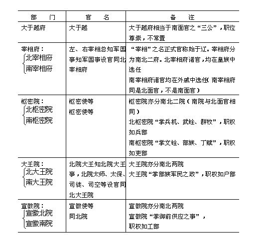 自辽太祖阿保机天赞(公元922年—926年)以后,契丹奴隶主贵族为了统治属於不同社会发展阶段,不同生产类型的各族人民,逐步建立了一套双轨制的或二元化的统治机构,即所谓北面官和南面官。所以叫做北、南面官,是因为他们的办公机关分别设在皇帝帐殿的北面和南面。《辽史·百官志一》说: 辽国官制,分北、南院,北面治宫帐、部族、属国之政;南面治汉人州县、租赋、军马之事。因俗而治,得其宜矣。 北面官主要是管理契丹和其他游牧民族的事务,南面官主要是管理汉人、渤海人的事务。 北面官的最高机构是北枢密院,《辽史·百官志一》说:“契丹北枢密院,掌兵机,武铨,群牧之政,凡契丹军马皆属焉。以其牙帐居大内帐殿之北,故名北院。”长官为北枢密院使,副官为知北院枢密使事。属官有知枢密院事、北院枢密副使、知北院枢密副使事、同知北院枢密使事、签书北枢密院事。南面官的最高机构是南枢密院(阿保机时代叫做汉儿司),《辽史·百官志一》说:“契丹南枢密院,掌文铨部族、丁赋之政,凡契丹人民皆属焉。以其牙帐居大内之南,故名南院。”长官为南院枢密使,副官为知南院枢密使事。属官有知南院枢密事、南院枢密副使、知南院枢密副使事、同知南院枢密使事、签书南枢密院事等。北、南两院虽然并列,实际上,主要的权力机构是北枢密院。 两院之下有北宰相府,设北府左、右宰相、总知军国事、知国事等官。掌佐理军国之大政,以皇族四帐充任。南宰相府,设南府左、右宰相、总知军国事、知国事等官,掌佐理军国之大政,以国舅五帐充任。 北大王院分掌部族军民之政。设北院大王(初名迭刺部夷离堇,太祖时分北、南院以弱其势,太宗会同元年改夷离堇为大王)、知北院大王事,以及北院太师、太保、司徒、司空等,其下则有北院郎君。又北院都统军司设北院统军使、北院副统军使、北院统军都监等官,掌北院从军之政令。北院详稳司,设北院详稳、北院都监、北院将军、北院小将军等官,掌北院部族军马之政令。北院都部署司,设北院都部署、北院副部署等官,掌北院部族军民之事。 南大王院的设置与北大王院同,掌南院部族诸事。 宣徽北院,太宗会同元年(公元938年)置,设北院宣徽使、知北院宣徽事、北院宣徽副使、同知北院宣徽事等官,掌北院御前祗应之事。 宣徽南院设置同宣徽北院,掌南院诸事。 在北面官系统中,还有大于越府,设大于越,如秦汉之三公,无职掌,不常置,位在百僚之上,非有大功德者不授,为辽代的尊官。因辽太祖以遥辇氏于越受禅,故此官不轻易授人,终辽之世,得于越重任者,只有耶律曷鲁、屋质、仁先三人,谓之“三于越”。 夷离毕院,设夷离毕、左、右夷离毕、知左、右夷离毕事等官,掌刑狱。 大林牙院,设北面都林牙、北面林牙承旨、北面林牙、左、右林牙等官,掌文翰之事。 敌烈麻都司,设特烈麻都、总知朝廷礼仪、总礼仪事等官,掌礼仪诸事。 大惕隐司,太祖建国时首设此机构,置惕隐(亦称梯里巳)、知惕隐司事、惕隐都监等官,掌皇族之政教。 辽国之先世,设有城郭、沟池、宫室等建置,惟以毡车为营,硬塞为宫,所以特别设置御帐官。对这类官员的选择,特别谨慎。《辽史·百官志一》说: 出於贵戚为侍卫,著帐为近侍,北南部族为护卫,武臣为宿卫,亲军为禁卫,百官番宿为宿直。奉宸以司供御,三班以肃会朝,硬寨以严晨夜。 从这段叙述可知辽统治者的御帐法制相当严密。北面御帐官今可考者,大概有如下几种: 侍卫司,设侍卫太师、太保、司徒、司空等官,掌御帐亲卫之事。 北护卫府,设北护卫太师、太保、司徒等官。掌北院护卫之事。皇太后宫另有左右护卫。 南护卫府,设官与北护卫府同,掌南院护卫之事。 奉宸司,设官未详,掌供奉宸御之事。 三班院,设左、右班都知、寄班都知等官,掌左、右,寄班之事。 宿卫司,设总宿卫事(亦称典宿卫事)、总知宿卫事、同掌宿卫事等官,专掌宿卫之事。 宿直司,设宿直详稳、都监、将军、小将军等官,掌轮直官员宿直之事。皇太后宫另有宿直官。 硬寨司,设硬寨太保一官,掌禁围枪寨、下铺、传铃之事。 皇太子惕隐司,设皇太子惕隐一官,掌皇太子宫帐之事。 北面著帐官