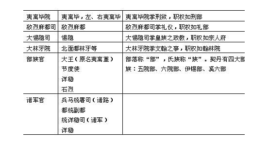 该族职官如下: 某部大王(本名夷离堇)、某部左右宰相、某部太师、太保、太尉、司徒(本名惕隐)。 某部节度使司、设某部节度使、节度副使、节度判官。 某部族详稳司、设某部族详稳、都监、将军、小将军。 某石烈、设某石烈夷离堇、某石烈麻普(亦称马步,本名石烈达剌干)。 某弥里(弥里,乡也),设辛衮(本曰马特本)。
