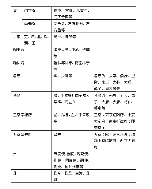其中有: 天下兵马大元帅府,设天下兵马大元帅、副元帅。由太子、亲王总领军政。 大元帅府,设大元帅、副元帅,由大臣总军马之政。 都元帅府,设兵马都元帅、副元帅、同知元帅府事诸官,由大将总领军马之事。 东、西都省,分设东、西都省太师,掌军马之政。 大将军府,设大将军、上将军、将军、小将军。各统领所治军伍之政令。 辽朝的南面官制大抵沿袭唐制,后来又兼采宋制而略有变通。中央亦有三省、六部、台、寺、院、监、诸卫、东宫之官。只是中书省初名政事省,中书令为政事令,中书舍人为政事舍人。此外,特设汉人行宫都部署院及十二宫南面行宫都部署司,是汉人参加契丹本部组织的机构。地方官也仿唐宋之制,设节度、观察、防御、团练、统军、招讨等使,以及刺史、县令等官。因为是杂采几朝的制度,所以官号不免有些紊乱。如财赋官,上京置盐铁司,中京置度支司,东京置户部司,南京置三司,西京置计司,辽西、长春、平州各置钱帛司,山后置转运司。官称虽殊,但职掌则同。《武溪集·契丹官仪》说:“置使虽殊,其实各分方域,重其出纳也”。 北面官制与南面官制的区别,主要在于北面部落以下和南面州、县以下官属的不同。至于南北两班朝官,称号固然有异,其职掌则多相同。《辽史·百官志一》说:“北枢密视兵部,南枢密视吏部,北、南二王视户部,夷离毕视刑部,宣徽视工部,敌烈麻都视礼部”。这段引文中的南北是指衙门的方位,所以北枢密和南枢密又称为北衙和南衙。 南面官不全是汉人,契丹人做南面官的也不少,并且也穿戴汉人衣冠。辽朝选派契丹大臣分任南京留守和西京留守,对当地的汉官起监督作用。南京留守通常由皇弟或皇叔充任,镇抚幽燕二州,虽以备宋为名,实亦寓有预防汉官不测之意。可见,南北两套官制是通过一定环节联结起来,统一到中央。 此外,辽朝还酌情采用了渤海的旧制。例如,渤海设中台省,辽朝也设中台省;渤海分建五京,辽朝也分建五京。 辽代的地方官制,于五京设官。五京是:上京临潢府(在今内蒙古自治区巴林左旗),中京大定府(在今内蒙古自治区宁城县),东京辽阳府(在今辽宁省辽阳市),南京析津府(在今北京市),西京大同府(在今山西省大同市)。五京各设“宰相府”,各有左右相、左右平章政事等官。各有“留守司”、“都总管府”等机构。 辽代学习汉官制,也有节度使,分道设之。道下有州,州有州刺史,县有县令,均沿用唐宋之制。 辽的地方行政组织,还有一种“头(或作投)下军州”。这种州,都是由辽的宗室、外戚、大臣和所属部族首领中立有战功的人,以其所分得的或所俘获的人口设置的。大的州都修建城廓,被俘获的汉人和渤海人,大部分安置在适宜于农耕的地区,有技艺的则令其从事手工业。这些从事农耕的人,一方面要向头下军州的贵族交纳实物地租,另外还须向辽政府交纳课税。城市里的商税,除酒税交给辽政府外,其他均归头下军州的贵族所有。头下军州的官吏除节度使以外,都由各州的贵族委派。头下军州的户口(头下户),一面依附本主,一面依附辽政府。随着封建因素的增长,头下户逐渐演变为“二税户”,与农奴身分接近。从十世纪末期(辽圣宗时)以来,在辽的行政组织上,中央集权的趋势已日益加强,过去所建立的一些头下军州,或因其领主的后嗣断绝,或因其领主犯罪,已逐渐收归中央直接管辖,法制也更多地采用汉制。 辽国的部落编置,在耶律阿保机时期,按照当时部落的情况,编为二十部。但是这二十部并没有包括契丹部落的全部。因为在调整编排前后,把各契丹部落内几个最尊贵的部落、氏族抽出来,称为“内”部落,其地位比其他部要高得多。这几个“内”部族就是:遥辇氏九帐族,横帐三父房族,国舅帐拔里,乙室已族,国舅别部。到了耶律隆绪时期,把他们确定为“辽内四部族”。 圣宗耶律隆绪时期,又把契丹贵族统治下的非契丹族各个部落和人户加以调整,编成三十四部。编入这三十四部的非契丹部落,也并不是非契丹部落的全部。耶律隆绪的调整编排,对于太祖二十部中的契丹族部落并没有作什么变动;对于其中非契丹族的部落,也只是把“奚王府六部五帐分”这个被称为“大部”的单位划分成六个一般的部落。 耶律阿保机设置“二十部”以前,各契丹族和非契丹族部落的首领本来都称为“夷离堇”。他为了突出五院、六院、乙室三部的地位,于设置二十部时,特别保留五院部、六院部和乙室部首领的夷离堇称号,而把其他部的首领改称的令稳,以显示这三部是大部,其他各部是小部。到了耶律德光时期,会同元年(公元938年)五院部、六院部夷离堇改称大王,二年(公元939年)乙室部夷离堇也改称大王。到了耶律隆绪时期,除了三个大部以外的契丹族部落首领均改为节度使,非契丹族部落的首领也称为节度使了。这一措施不仅是名称上的划一,而且是在封建化道路上前进的一个反映。 附:辽代官制简表