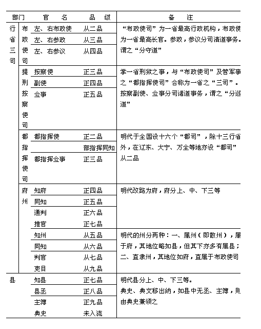 明代地方区域的划分,除南、北两京外,还有十三个布政司,明之布政使司是由元代行中书省演化而来的,《明史·职官志四》载: 洪武九年(公元1376年)改浙江、江西、福建、北平、广西、四川、山东、广东、河南、陕西、湖广、山西诸行省俱为承宣布政使司,罢行省平章政事、左,右丞等官。改参知政事为布政使……十五年(公元1382年)置云南市政司……永乐元年(公元1403年),以北平布政司为北京……十一年(公元1413年)置贵州布政司……宣德三年(公元1428年)除两京外,定为十三布政司。 承宣布政使司,设左、右布政使各1人(从二品),左、右参政(从三品),左、右参议,无定员(从四品。参政、参议因事而添设,各省不等)。经历司,经历1人(从六品),都事1人(从七品)。照磨所,照磨1人(从八品)、检校1人(正九品)。理问所,理问1人(从六品)、副理问1人(从七品)、提控案牍1人。司狱司,司狱1人(从九品),库大使1人(从九品),副使1人、仓大使1人(从九品)、副使1人。杂造局、军器局、宝泉局、织染局,各大使1人(从九品)、副使1人。 布政使是一省最高的行政长官,掌一省之政,朝廷有德泽、禁令、承流宣播,下达于有司。凡僚属满秩,负责考察其称职与不称职,上报达吏部、都察院。每三年则率其府、州、县正官,朝觐京师,以听察典。参政、参议分守各道,及派管粮储、屯田、清军、驿传、水利、抚民等事。经历、都事负责文书往来。照磨、检校、典勘理卷宗,理问典刑名。 明初置提刑按察司,洪武十四年(公元1381年),于各道置按察分司。十五年(公元1382年),又在府州县置按察分司。建文时,改为十三道肃政按察司,每司设按察使1人(正三品)、副使(正四品)、佥事无定员(正五品)。经历司,设经历1人(正七品),知事1人(正八品)。照磨所,照磨1人(正九品)、检校1人(从九品)。司狱司,司狱1人(从九品)。 按察使掌一省刑名按劾之事。纠官邪,■奸暴,平狱讼,雪冤抑,以振扬风纪而澄清其吏治。副使、佥事,分道巡察,《明史·职官志四》载,洪武十五年,以儒士王存中等531人为试佥事,每人按察二县,“凡官吏贤否,军民利病,皆得廉问纠举。” 又有都指挥使司,掌各省之军事。与布政使司、按察使司合称为“三司”。都、布、按三司鼎立之制,虽能防止地方权力之扩大,但又不免酿成运用不灵之弊。所以明中央又派遣监察御史或部院大臣出任总督、巡抚、巡按各差,以驾凌于三司之上。《明史·职官志二》说: 其在外加都御史或副、佥都御史衔者,有总督、有提督、有巡抚,有总督兼巡抚,提督兼巡抚,及经历、总理、赞理、巡视、抚治等员。 “巡抚”之名即起于明代,据沈德符《万历野获编》记载,“洪武二十四年(公元1391年)辛未,太祖令皇太子(即懿文太子)巡抚陕西地方,巡抚之名,始见于此。”永乐十九年(公元1421年)遣尚书蹇义等26人巡行天下,安抚军民。此后,逐渐派一些尚书,侍郎,都御史,少卿等官去巡抚各处的边境腹地,办完事情就回朝廷复命。这样的官员,当时称为“巡抚”,或名“镇守”。巡抚兼军务的加提督,有总兵地方加赞理或参赞,所辖多而事务重者加总督。以尚书、侍郎任总督军务的,皆兼都御史,以便行事。由于总兵、宦官也可称为“镇守”,容易造成混乱,所以后来凡是文职官员奉命出朝,就一律称为“巡抚”,以与“镇守”相区别。此外,明代还 派监察御史巡视各省,以资监察,称为“巡按”。“巡抚”、“巡按”略有不同,但这些都是明代才设置的差务。由于这些官职是临时性的,所以各处名称都不同。比较经常设置的,有总督漕运兼提督军务巡抚凤阳等处兼管河道1员,总督蓟、辽、保定等处军务兼理粮饷1员,总督陕西三边军务1员,总督两广军务兼理粮饷带管盐法兼巡抚广东地方一员,总理粮储提督军务兼巡抚应天等府1员,巡抚顺天等府地方兼整饬蓟州等处边备1员,巡抚保定等府提督紫荆等关兼管河道1员,巡抚南赣、汀韶等处地方提督军务1员。巡抚偏沅地方赞理军务1员,抚治郧阳等处地方兼提督军务1员。这些官员设置都是以边防或镇压人民为主要任务的。日久之后,便变成定制,到清代才将督抚看作一省的最高长官。总督在明代有称总制的,所以清代一般还称总督为制台。而督抚仍用钦差官的体制,不给印绶而给关防,称部堂、部院,而不单称总督,巡抚。 布政使属下的参政、参议分司诸道的有督粮道,督册道、各处分守道。按察使下之副使、佥事分司诸道则有提督学道、清军道、驿传道、各处分巡道。两直隶无布、按两司,故北直隶各道寄衔于山东、山西;南直隶各道寄衔于山东、浙江、江西、湖广。至清代北直隶成立直隶一省,南直隶成立江苏、安徽二省,均设布、按两司,省制就比较合理而完整了。