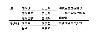 都指挥使司为明代地区军事总机构,长官有都指挥使1人(正二品)、都指挥同知2人(从二品)、都指挥佥事4人(正三品),其属有经历司经历(正六品)、都事(正七品)。断事司断事(正六品)、副断事(正七品)、吏目各1人。司狱司司狱(从九品),仓库、草场、大使、副使各一人。行都指挥使司,设官与都指挥使司同。长官之中有一人统司事,称掌印,简称都司,位次在布、按两司之上。《明史·职官志五》说:“都司掌一方之军政,各率其卫所以隶于五府,而听于兵部。” 卫指挥使司设官与京卫同。外卫皆统于都司及行都司。卫以下为千户所,千户所又辖百户所。千户所有正千户1人(正五品),副千户2人(从五品),镇抚2人(从六品)。其属吏目1人。千户所辖百户所10个,共有百户10人(正六品),总旗20人,小旗100人。刑狱则归镇抚掌管。凡卫所皆隶于都司,而都司又分隶于五军都督府。自卫所以下,其官兵多世袭,这是明代特殊制度之一。 都督府的都督名称后来变为空头的官阶,而统兵之官则须别加总兵、副总兵、参将、游击将军、守备、把总等名目。《明史·职官志五》:“总镇一方者为镇守,独镇一路者为分守,各守一城一堡者为守备,与主将同守一城者为协守。又有提督、提调、巡视、备御、领班、备倭等名。凡总兵、副总兵一职均须有公、侯、伯、都督爵衔者充任。其总兵挂印称将军者,云南曰征南将军,大同曰征西将军,湖广曰平蛮将军,两广曰征蛮将军……其在蓟镇、贵州、湖广、四川及儹运淮安者,不得称将军挂印。宣德间,又设山西、陕西二总兵。嘉靖间,分设广东、广西、贵州、湖广二总兵为四,改设福建、保定副总兵为总兵,又添设浙江总兵。万历间,又在临洮、山海增设总兵。至明代末年,总兵官增置繁多,不可胜记。总兵在明代本为无品级之差委,至清代则为正二品的正规武职。 此外,还有军民府、土州、土县,其官员设置,与府、州、县制相同。 附:明代地方官制简表