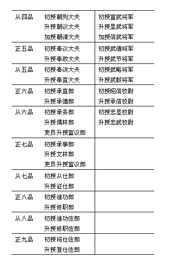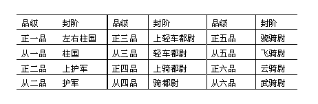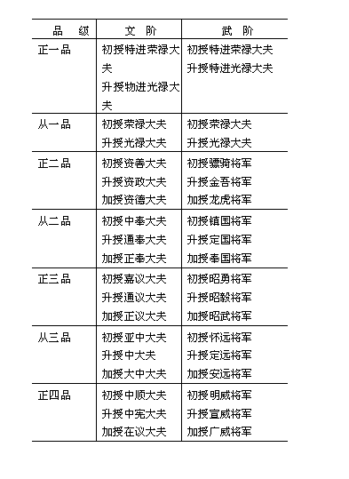 明代除宗室以外,文武有功之臣及外戚之封爵有公,侯,伯三等,只有岁禄,而无实际之封邑。但后世可以袭封。功臣则给铁券,封号分为四等:(一)佐太祖定天下者,称开国辅运推诚;(二)从成祖起兵,称奉天靖难推诚;(三)奉天翊运推诚;(四)奉天翊卫推诚。武臣称宣力武臣;文臣称守正文臣,岁禄以其功劳大小为差。凡封后而又立功者,或进爵或增禄。受封而有贤才者,充任京营总督,五军都督府掌佥书,南京守备,或是出充镇守总兵官。才德低下者,则食禄奉朝请而已。凡年幼而嗣封者,则先入国子监读书。嘉靖八年(公元1529年),定外戚封爵不得世袭,或有世袭一、二代者,则出于特恩。 附表一:明代文武官散阶简表