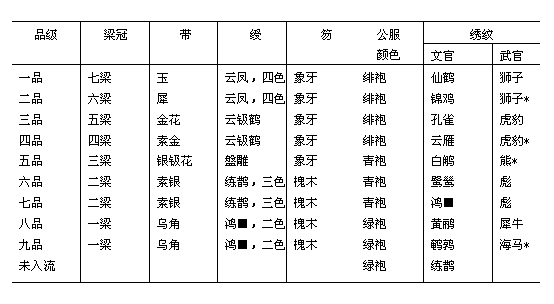 ②本表所列之俸额,乃洪武二十五年(公元1392年)重定内外文武官岁给俸禄之制。 附表四:明代品官单服简表