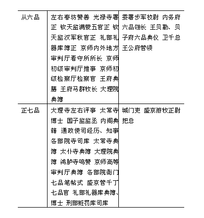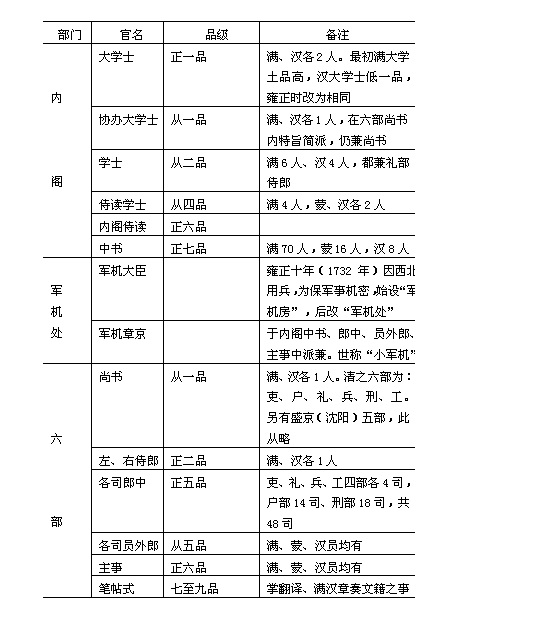 清沿明制,于顺治元年(1644年)设詹事府,为辅导东宫太子之机构,同年十一月裁撤,其事务并入内三院。顺治九年(公元1652年)复置,设詹事、少詹事,以内三院官兼任。康熙五十一年(公元1712年),废立皇太子后停止。乾隆十八年(公元1753年)谕:“詹事府东宫僚佐,储贰未建,其官原可不设,第以翰林叙进之阶,姑留以备词臣迁转地耳”①。自此以后,詹事府官员专备翰林院迁转之资。 詹事府设詹事满、汉各1人(正三品)、少詹事满、汉各1人(正四品),左、右庶子满、汉各1人(正五品),洗马满、汉各1人(从五品)、左、右中允满、汉各1人(正六品),左、右赞善满、汉各1人(从六品),主簿满、汉各1人(从七品)、笔帖式6人。 詹事府的职掌是:凡皇帝坐朝或秋审、朝审以及九卿、翰、科、道会议之事,詹事、少詹事均得“侍班”或参加集议。凡纂修实录、圣训,詹事府詹事、少詹事例得充任副总裁官及纂修官。纂修其他书史,少詹事皆得充任纂修官。此外,有些职掌是与翰林院互兼的。清初规定,凡东宫千秋节(东宫诞辰)及元旦、冬至行礼庆祝、表笺文式,由詹事府坊局官撰拟颁发。 詹事府内部机构分左右春坊、司经局及主簿厅,其职官及分掌如下: 左右春坊:设左、右庶子满、汉各1人,左右中允满、汉各1人,左右赞善满、汉各1人,掌记注、纂修之事。其汉员,分别兼翰林院侍读、侍讲、编修、检讨等衔。 司经局:设洗马满、汉各1人,掌经籍、典制、图书刊刻的收藏。其汉员兼翰林院修撰衔。初设汉正字2人,掌缮写讲章及装潢之事。 主簿厅:设主簿满、汉各1人,掌文移;笔帖式满6人,掌翻译。 詹事府的机构掌章奏、文移事务,另设满、汉主簿2人管理。 从詹事府的具体执掌看,已无本府的专职,实际上变成了翰林院的辅佐机构。所以光绪二十八年(公元1902年),改革官制,实行“新政”,便以詹事府名实不符,首先被裁撤,其事务归入翰林院。 附表一:清代中央机关文武职 主要官员品级表