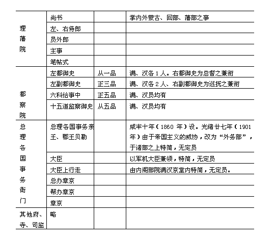 清初仿明制,于崇德元年(公元1636年)五月设立都察院。皇太极下谕:“凡有政事背谬,及贝勒大臣有骄肆侵上,贪酷不法,无礼妄行者,许都察院直言无隐。即所奏涉虚,亦不坐罪;倘知情蒙蔽,以误国论。”①顺治初年又规定:“凡朝廷政事得失,民生利弊,以时条上,百官有奸贪污绩,亦得据实纠弹。”②可见,清代的都察院其职能与历朝的御史衙门差不多。都察院初设承政1人,左右参政各2人。顺治元年(公元1644年)改承政为左都御史,参政为左副都御史。三年规定左副都御史满、汉各2人。五年则定左都御史满、汉各1人。右都御史,为总督兼衔。右副都御史为巡抚、河道总督、漕运总督兼衔,都不设专员。左都御史是都察院的主管官员,《清史稿·职官志二》说:“左都御史掌察覈官常,参维纲纪。” 都察院除监察政治得失外,具体担负的工作是:参预九卿一起议奏折;凡重大案件与刑部、大理寺公同审断;稽察各级衙门、官吏办事的优劣;检查注销文书案卷及封驳事;监察乡试、会试、殿试;巡视各营等事务。 都察院的内部机构设有直接为堂官办事的九房一库。各房库共设经承25人,其中印房1人,吏房3人,户房3人,礼房2人,兵房3人,刑房4人,工房3人,火房2人,本房2人,架阁库1人,分理堂官交办的各有关事务及管理伙食、保管档案等事。其下办理行政事务的机构有: 经历厅:原名司务厅,顺治元年(公元1644年)设满司务1人,改称经历后,定经历满、汉各1人(正六品)。承办科道差事、五城注销,并管辖吏役等事。据《光绪会典事例》卷1030所载,乾隆六年(公元1741年)议准吏、户、刑部一些具体事项归经历管理。 都事厅:顺治元年(公元1644年)设满都事2人,汉都事1人,乾隆十七年(公元1752年)改满、汉都事各1人(正六品),负责承办缮本及满官册籍。 此外还有值月处、督催所等机构。 都察院所属执行监察任务的机构有: 十五道:是按省区划分的机构,计有京畿、河南、江南(包括江苏、安徽)、浙江、山西、山东、陕西、湖广、江西、福建、四川、广东、广西、云南、贵州等道。十五道的职官各有掌印监察御史(满、汉各1人),一般的监察御史,各道的人数不同,十五道共有掌印监察御史30人,一般监察御史26人,总数56人,满、汉各28人(满御史内有宗室4人,蒙古2人,汉御史内兼用汉军),笔帖式32人,经承49人。十五道总数为137人①。 十五道监察御史初有“坐道”、“协道”之分。“坐道”为空衔,并不办本道之事;“协道”也不固定办理某道事务。至乾隆十四年(公元1749年)始固定各道职掌:除负责稽核本省刑名案件外,并令稽察在京各衙门事务。各道所稽察之衙门,《光绪会典》卷69所载如下: 京畿道:稽察内阁、顺天府、大兴、宛平二县,会办京察、大计、军政等事。乾隆二十年(公元1755年)奉旨参治院事。 河南道:稽察吏部、詹事府、步军统领衙门及五城察院等。 江南道:稽察户部宣课司、宝泉局、三库、左右两翼税务衙门及十京十三仓。 浙江道:稽察礼部、都察院。 山西道:稽察兵部、翰林院、六科、中书科、总督仓场及所属坐粮厅、大通桥与通州两仓。 山东道:稽察刑部、太医院。 陕西道:稽察工部、宝源局。监督宝源局发放兵饷,覆勘工部承办在京之工程。 湖广道:稽察通政使司、国子监。 江西道:稽察光禄寺。 福建道:稽察太常寺。 四川道:稽察銮仪卫。 广东道:稽察大理寺。 广西道:稽察太仆寺。 云南道:稽察理藩院、钦天监。 贵州道:稽察鸿胪寺。 光绪三十二年(公元1906年),增设辽沈、甘肃、新疆3道,改江南道为江苏、安徽2道,改湖广道为湖南、湖北2道,共计为20道。 六科 清初仿明制,设吏、户、礼、兵、刑、工六科,掌勘察官府公事。初为独立机构,至雍正元年(公元1723年)始隶都察院。六科的职官各有掌印给事中(满、汉各1人),给事中(满、汉各1人),笔帖式80人,经承63人。六科总数为167人。掌印给事中,雍正七年(公元1729年)定为五品,光绪三十二年(公元1906年)升为正四品。给事中,初为七品,雍正七年升为正五品。 六科的具体职掌是: 掌科抄:各科每日派给事中1人赴内阁接收题本,按题本内容,抄给各有关衙门分别承办。另摘录两份,一份叫史书,供史官记注用;另一份叫录书,存储于科署,以备编纂用。 掌封驳:《光绪会典事例》卷1014载,顺治初年规定:“凡部院督抚本章,已经奉旨,如确有未便施行之处,许该科奏还执奏。如内阁票签批本错误,及部院督抚本内事理未协,并听驳正”。“封还”和“驳正”是六科的主要职掌,但六科官员出于对皇帝及权臣的畏惧,为保住自己的官爵,这一职掌事实上是很少执行的。 此外,六科还分稽各项庶政,并分别注销各有关衙门文卷(即考核各项案件是否限期办妥)。各种稽核分工是:吏科稽核人事,注销吏部、顺天府文卷;户科稽核财赋,注销户部文卷;礼科稽核典礼事务,注销礼部、宗人府、理藩院、太常寺、光禄寺、鸿胪寺、国子监、钦天监等衙门文卷;兵科稽核军政,注销兵部、銮仪卫、太仆寺等衙门文卷;刑科稽核刑名案件,注销刑部文卷;工科稽核工程,注销工部文卷。乾隆十四年(公元1749年)奏准,都察院本身由刑科稽察。 六科又负责颁发官员敕书,凡内阁给官员之敕书,均交由六科发给,任满再送科缴还内阁。文武官赴任文凭,分由吏、兵两科注写期限。考察文武官员的“京察”,大计册、各项奏销册、文武生童学册,也均由六科分别察核。秋审,朝审案件,各道题签后,