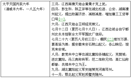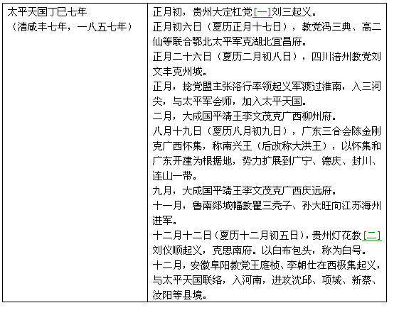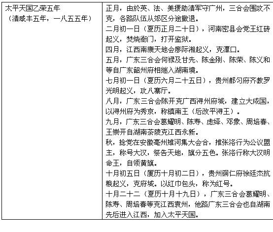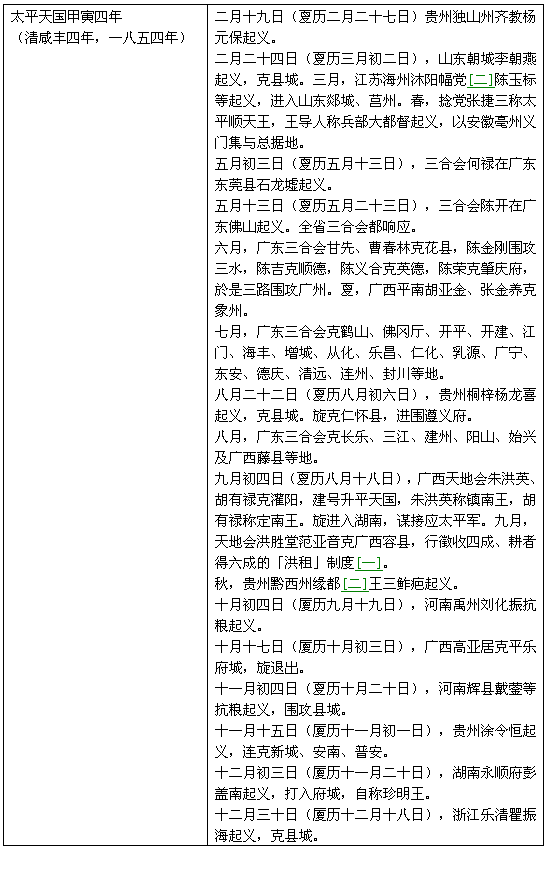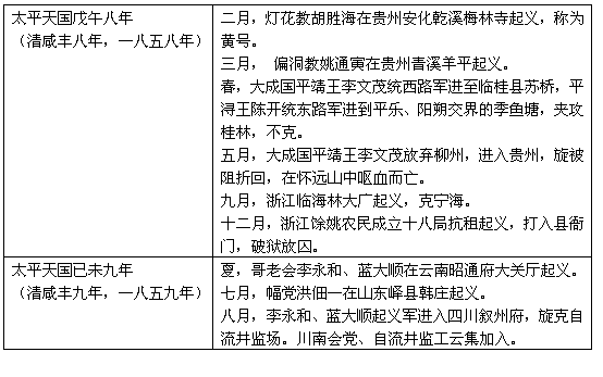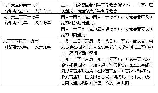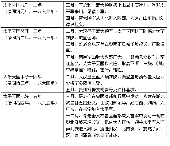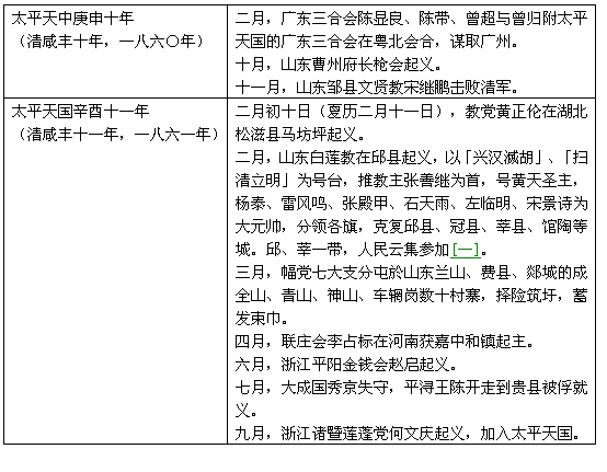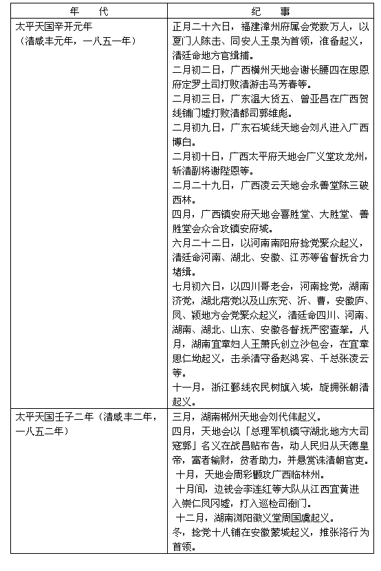 天地会起义,为金田前驱。太平天国既建,四方响应,南方以天地会为首,北京以捻党为首,各地会党都一时并起,争先倒清,大大小小的起义活动遍布中国。其中最著名的,在福建,有以黄德美为首的小刀会(天地会支派)起义。在苏南、上海,有以刘丽川为首的小刀会起义。在广东,有以陈开为首的三合会起义。在淮河流域,有以张洛行为首的捻党起义。在云南、四川,有以李永和、蓝大顺为首的哥老会(也是天地会的支派)起义。 有人说太平天国拒绝天地会归附。这种说法是错的。太平天国曾主动招致天地会和捻党加人,对其他会党的加入也一律欢迎。文献具在,事宾昭然[一]但太平天国对加入的会党军队,未能予以改编,就不可能如同自己的军队一样加以教育。反之,他们带来坏作风,太平军裹面,有些部队,受了他们的坏影响,便把太平天国军队的严明纪律破坏了。而对那些各自为战,忽起忽灭的会党队伍,又未能大力争取他们加入,统一革命战线以压倒清朝统治者。 至于天京失陷后第三年正月,清廷命严缉军营哥老会,显然是针对当时哥老会在曾国藩湘军中起义事件而发。哥老会就以不断地在湖南起义来回答清朝的镇压。这一大事,已显示出了南方会党在辛亥革命中推翻清朝的巨大潜力。兹将金田起义后,会党起义大事列表于后: