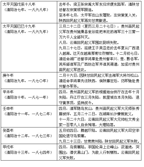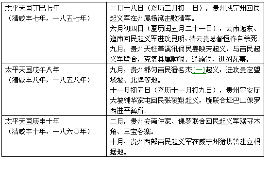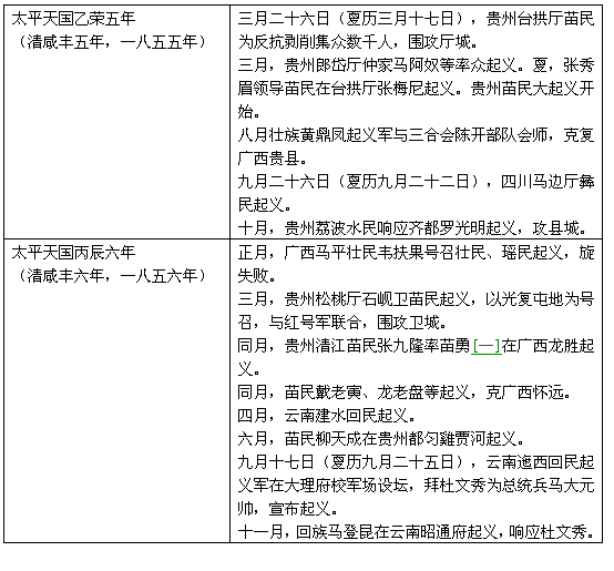 中国是一个统一的多民族的国家。清朝封建统治阶级封国内各族人民实行民族压迫政策。在少数民族地区,清皇朝不仅采取各种高压手段镇压各族人民的反抗,并且和少数民族中的反动上层结合起来压迫和剥削各族人民。他们为了保持封少数民族的封建统治,还经常挑起民族纠纷,遂使各民族、各地区之间经常发生械斗和仇杀。在这些地区,阶级矛盾和民族矛盾十分尖锐,各族劳动人民过着牛马一般的生活。 太平天国起义,一声春雷,各族人民四起响应,造成全国起义的大形势。他们抱着一个共同的目标,为推翻代表地主阶级的清朝统治,建立一个各族兄弟一家的中国而奋斗。他们都蓄发易服,以恢复祖国古代的衣冠制度,作为共同行动的鲜明标志。在政治上,云南回民起义军领袖杜文秀提出各族「联为一体」的主张,他又谦辞进位称王,提出与太平天国互相支持,共安中国的主张。在经济上,苗民起义军到处打倒地主,解放苗、汉农民。当时各族人民起义,充分表时了毛泽东所说:「民族斗争,说到底,是一个阶级斗争问题」[一],「在民族斗争中,阶级争斗是以民族斗争的形式出现的,这种形式,表现了两者的一致性」[二]这一道理。 这一次全国各族起义,包括满族、蒙古族在内,在遵王赖文光领导的大军裹面有满族和蒙古族参加[三],在杜文秀领导的云南回民起义军裹面有满族参加。清朝统治者面临这全国性大起义,使它顾此失彼,大大地分散了力量。而以太平天国为中心的各族人民大起义,在反对共同敌人—清朝封建统治阶级和外国资本主义侵略者的斗争中,彼此支持,互相激荡,加深了汉族和其他兄弟民族人民的革命情谊,促进了民族的团结,巩固了祖国的统一。兹将当时各族人民起义大事列表於后。