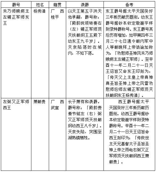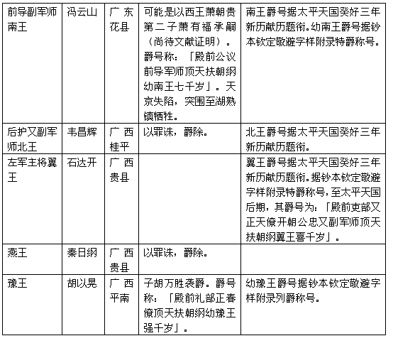 太平天国革命,杨秀清、萧朝贵、冯云山、韦昌辉、石达开与天王同谋起义,故首封东、西、南、北、翼五王。到建都天京后,以功封秦日纲为燕王,胡以晄为豫王。太平天国前期所封仅此七王。其后天京事变,秦日纲附从韦昌辉,天王诛韦、秦,并废除他们的爵位,所以北、燕没有嗣君。