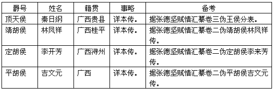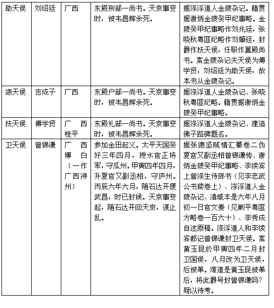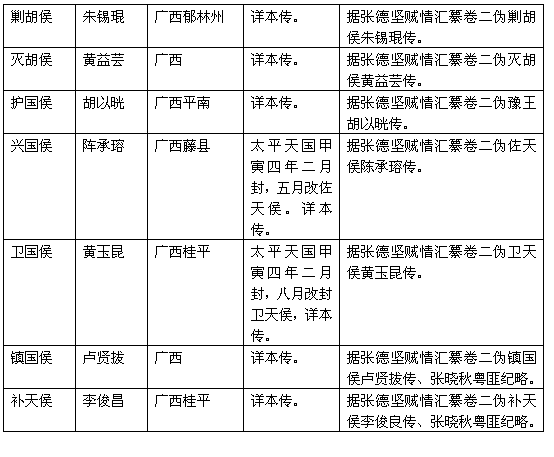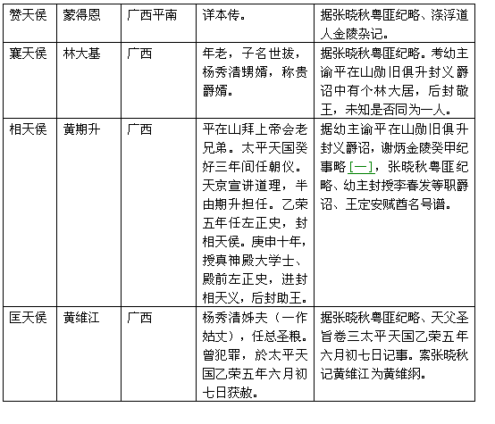 太平天国封侯,自癸好三年九月封秦日纲和北伐大将林凤祥等开始。其后论功行赏,更封胡以晄、陈承瑢诸人[一]。不久,秦日纲、胡以晄封王,林凤祥等牺牲,侯爵以佐天侯陈 承瑢位次居首。凡侯爵都系「真忠报国」,世袭。这时期得封侯的仅约二十人,虽功高如冬官正丞相罗大纲远不得与其选,故人都视为很光荣的大典。但黄维江、刘绍廷、吉成子、傅学贤等都以东王杨秀清亲信得封侯,实不协公论。这却是杨秀清的专擅。兹将前期所封侯爵表列於后: