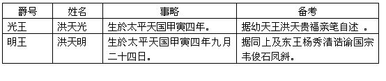 天王有五子,长即幼天王洪天贵福。戊午八年颁行的太平礼制,在世子以下,即接第三子,次子当系早夭。第三子洪天光封光王,第四子洪天明封明王[一]。第五子洪天佑,承嗣东王杨秀清。太平天国末期颁布朝天朝主图[二],有「爷、哥、朕、幼、光、明、东」,「光、明、东、西八数龕」等句,知天王晚年仍祇有四子。光、明二王年幼,朝天朝主图中缺他们的座位,故图上诗说「共成四七二十八,光、明加上三十增」便是。天京陷落时,光、明二王与幼天王走依李秀成。李秀成独带幼天王出走,光、明二王后不知下落[三]。