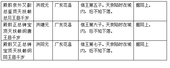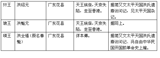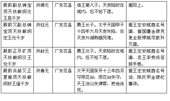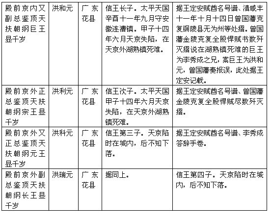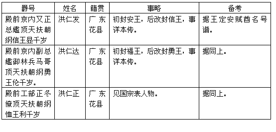 洪氏封王,以洪仁发封安王,洪仁达对福王为最先。时约在太平天国丙辰六年十二月[一]。嗣因朝中不服,改封天安、天福。 至己未九年春,洪仁玠到天京,封为干王。其后广封王爵,洪氏兄弟子侄遂都封王。除洪仁玠为太平天国后期€「朝纲之首领」,已见於后期王爵人物表外,兹将洪诸王可考的表列於下。