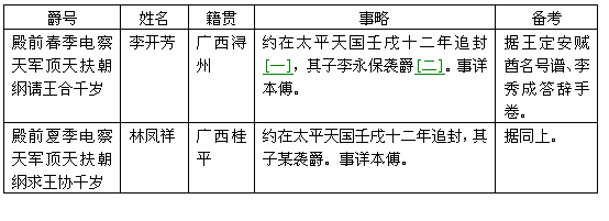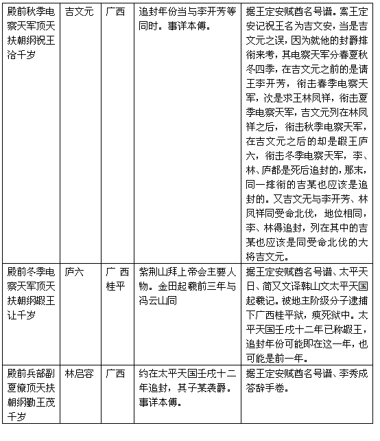 太平天国晚年广封王爵,因对开国功臣也加以追封。在太平天日、李秀成答辞手卷及王定安贼酋名号谱中可考的仅有五王,所封或不止此数。他书记载如沈懋良江南春梦庵笔记中「所谓天堂路通碑」上题名,谬误可案,这是一部大伪书,是不可信的[一]。