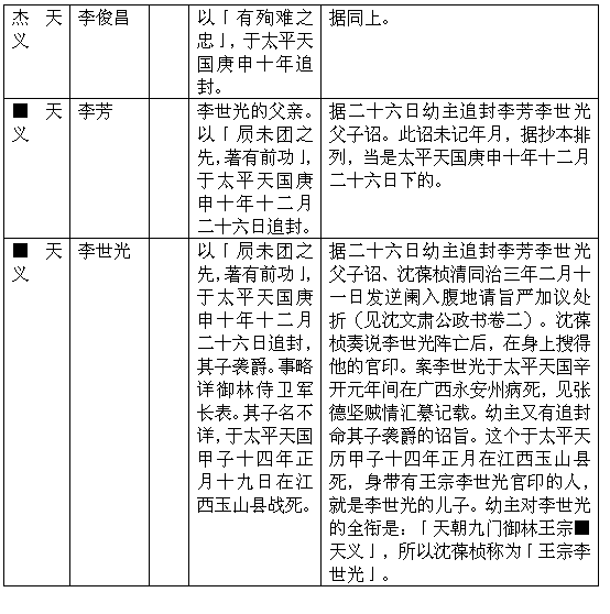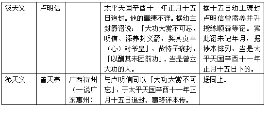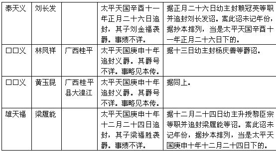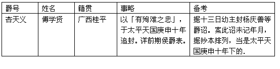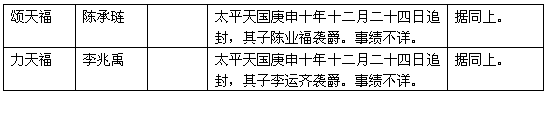 太平天国设义、安、福、燕、豫、侯六等封爵,以广封功臣。因对已去世的功臣,亦予追封,以酬其功。得追封的人当不少。现只从残存的幼主诏旨中,考出寥寥十多人,列于后表。