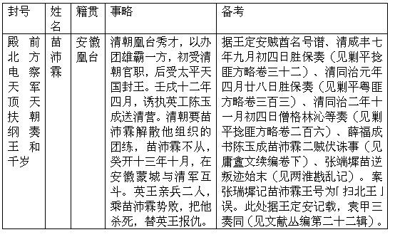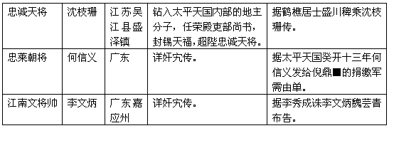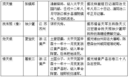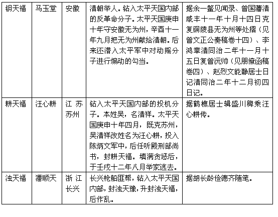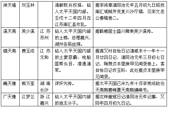 奸宄是钻入太平天国内部进行颠覆活动的敌人。本书除在传部份编有奸宄传,以揭露其鬼蜮技俩外,并把太平天国后期打入内部的奸宄,有爵职可查的列于下表,使牛鬼蛇神暴露于光天化日之下。