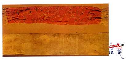 宽4.4厘米,两条均以三段接成筒形,红绢地,以黄、蓝、香色纯正线用锁绣法