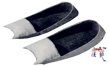 前端两边起尖,微微翘起,帮、面、底皆为白色麻布,平纹组织,麻线纳缝,垫用细金丝草编织。