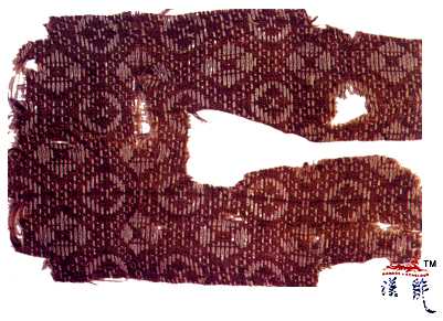 .菱格柿蒂纹双面锦,长15厘米,宽9.5厘米,原为女舞俑半臂。白、褐两