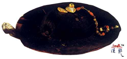 .丝织纱帽,高9厘米,口径20厘米,通缘径35厘米,覆碗形楠,宽缘。制作简洁,别具