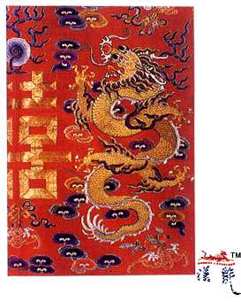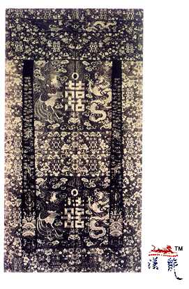 彩绣龙凤双喜纱帘,红纱本,帘身为朱红色亮纱,上施平金彩绣,纵185.6厘米,横98.8厘米,