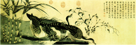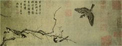 赵佶的花鸟画极注意禽雀与自然环境的密切关系。其画风可分为二类:一是细笔,造型严谨,笔法工整精细,色彩绚丽典雅,传有《祥龙石