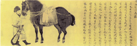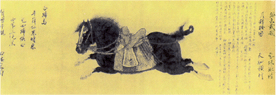 赵霖,雒阳(今河南洛阳)人,金世宗朝供奉内廷。他的《昭陵六骏图》是以宋刻昭陵六骏的碑刻拓片(今存陕西礼泉县昭陵博物馆)为本,师从李公麟描法,设色而成。该画追寻的是初唐建功立业的奋发精神,正是当时社会总体风貌的表现,六马形象有的巍然屹立,有的延膊缓步,有的奋蹄疾驰,都画得凝重有力,颇具石刻风味。其余如丘行恭像、鞍辔杂佩和箭疮位置,画卷也都一一誊写。