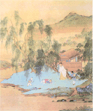 谢缙,缙,一作晋,字孔昭,号叠山、兰庭生、深翠道人,晚年称蔡丘翁,生卒年不详,吴(今江苏苏州人),寓居金陵20余年。山水师王蒙、赵源,造诣既精,得其渺远深意。谢缙所作《溪隐图》画远山层叠延绵,湖面空阔平静,洲渚岸边杂树葱郁,渔人泊船后向家中走去,围栏内,茅棚下,一女子席地而坐,用笔遒劲秀逸,画面空灵而苍郁。