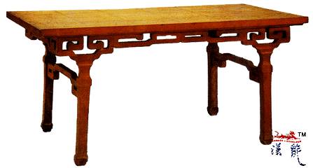 下起透空回纹牙条,四方腿,上端做斗拱式上撑起牙条,足端呈椿头形,