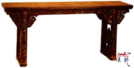 夹头榫结构;足下带托子,挡板部位雕云头;牙条,腿足,均开光嵌螺钿