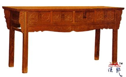屉下出壶门式牙条,方腿,除了两侧接牙条,还与桌角接角牙,系一腿