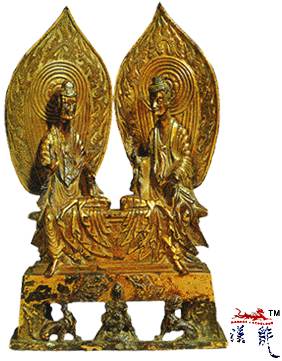 北魏 二佛论经像(纪元518年)高26公分 巴黎季博物馆藏 根据莲花经记载,一日佛祖讲道,天空忽 然显现一尊宝塔,宝塔内坐着多宝如来。多宝 如来是远古时代的佛祖,早已进入涅槃的境界 ,他曾许愿在佛祖宏法时显现佛身,以证明涅 槃并非死灭。释迦牟尼见到多宝如来,立即飞 入宝塔,坐於多宝如来身侧,开始对众人讲道 宏法。 这座金铜像是洛阳龙门风格的代表,鸠形 鹄面、傲骨嶙峋的造型与当时清谈食丹之风可 相印证 。释迦侧身曲膝盘坐,额方、颈方、 颈长,嫣然而笑,两佛相对,右手向下,左手 身上作施无畏印相,脸上的表情、手势及从态 ,充分表现出彼此心领意会以默契。佛祖(代 表现在)与多宝如来(代表过去)的对话,像 两盏燃烧的明灯,开导众生沉迷的心 ,指引 众生未来的方向。 |