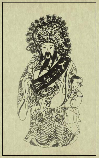 “天官赐福”,语出《梁元帝旨要》:“上元为天官司赐福之辰;中元为地官赦罪之辰;下元为解厄之辰。”后来道教又以上元天官正月十五日生,中元地官七月十五日生,下元水官司十月十五日生,届期设斋诵经。明刻《三教搜神大全》卷一“三元大帝”载:“上元一品天官赐福紫微帝群,正月十五日诞辰。”民间则于春节(农历新年)开始,敬天官以盼福音。