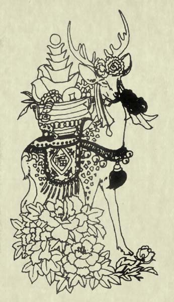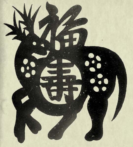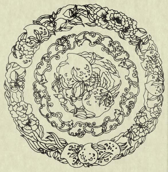 画面上绘有寿星乘鹿、随从举桃、蝙蝠飞于空中的图形。“蝠”与“福”谐音,“鹿”与“禄”谐音,均系吉祥仙物。寿星老、仙桃象征长寿。寿星老也称寿仙老,属南极老人星,有能观察天下太平之说。《史记.封禅书索隐》:“寿星即南极老人星也。祠之以祈福寿。”