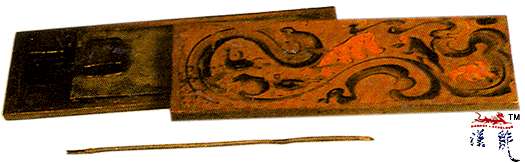 厘米,漆盒长21.5厘米,高1.8厘米,长条形,砚面留有墨迹,盖面与盒底,均用