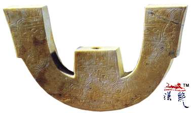 石器时代良渚文化。三叉形玉器,高4.8厘米,宽8.5厘米,厚0.8