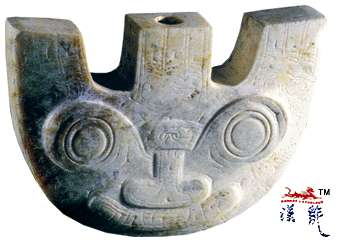 石器时代良渚文化。三叉形玉器,高5.2厘米,宽7.4厘米,厚