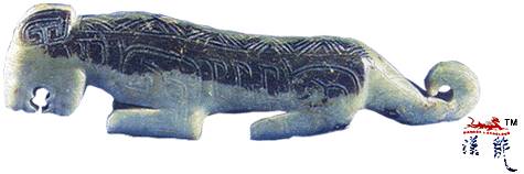 .周,玉虎,青色,有黑斑,体扁长,呈伏卧状,方形头部微下垂,张口露齿,竖耳,四腿卷