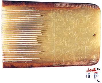 国,云纹玉梳,青色,体扁平,略呈梯形,梳背平直,转角圆滑,厚度至齿口渐薄。