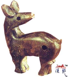 又长,弓背,短尾上翘,四肢粗壮,并立着地。无角,似为小鹿,高4厘米,长3.7厘米,1974