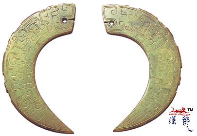 秋,玉冲牙,青色,体扁平,形似兽牙,两面皆以双钩饰一张口,侧身的夔龙纹,